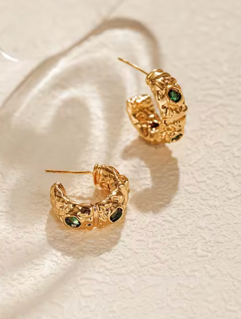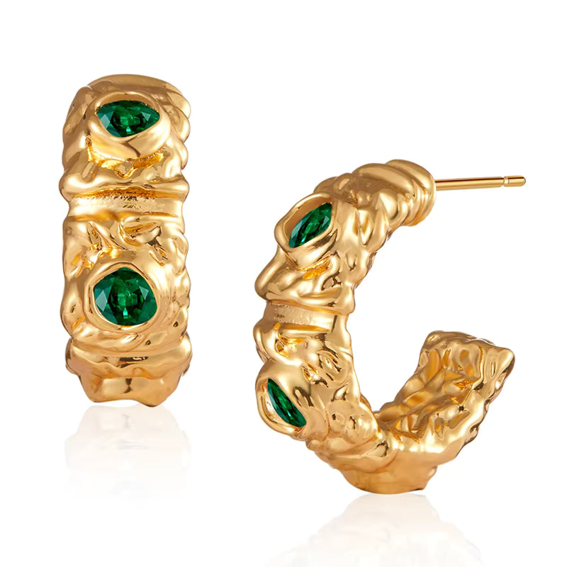 With their raw elegance and vibrant detail, the Emerald Relic Hoops are jewelry meant to feel like a keepsake unearthed from another era.